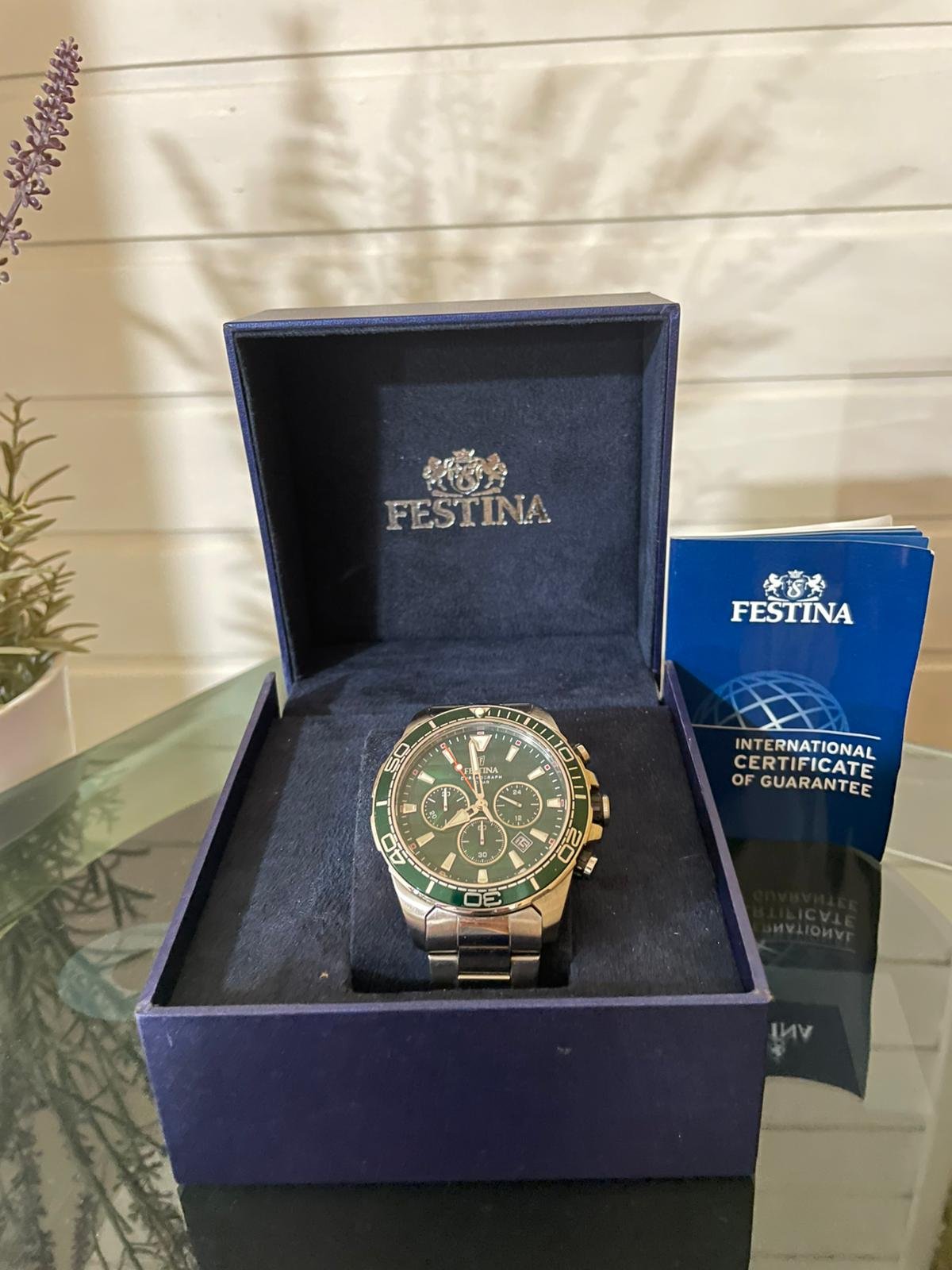 Se intercambia reloj Festina original en excelente estado 🕒 Modelo cronógrafo con diseño deportivo y elegante. Caja metálica, correa de acero inoxidable, esfera verde con detalles plateados. Funciona perfecto, con batería reciente y muy poco uso. Viene en su caja original (como se ve en la foto).
